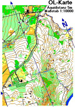 Im Prinzip gleichen die OL-Karten normalen Landkarten, nur in einem Punkt gibt es einen wesentlichen Unterschied: Die Nordlinien. Auf der Beispielkarte sind dies die blauen Pfeile (auf manchen Karten auch schwarz dargestellt). Diese Nordlinien zeigen vom magnetischen Südpol zum magnetischen Nordpol; jeweils zwei parallele Nordlinien besitzen einen Abstand von 500 Metern. Warum sind die Nordlinien nicht zum geographischen Nordpol ausgerichtet ? Dies liegt daran, daß der Winkel zwischen magnetisch Nord und geographisch Nord (die sog. Deklination) je nach Land sehr unterschiedlich sein kann. Und da die OLer sich mit ihrem Kompaß an magnetisch Nord orientieren, hat es sich eingebürgert, diesen Pol als Referenzpol zu verwenden.